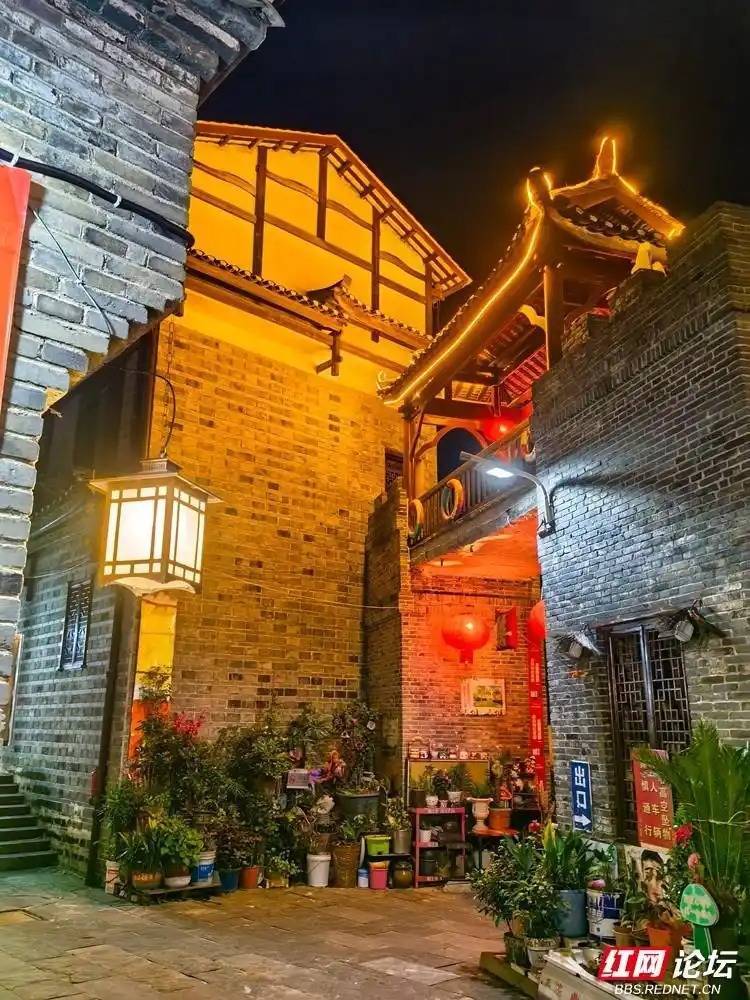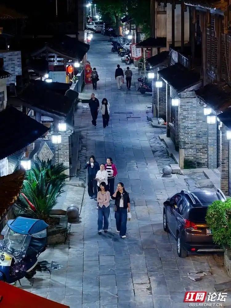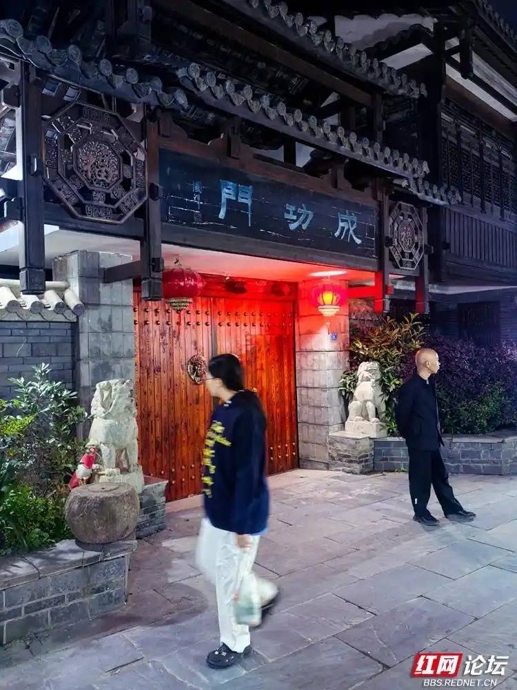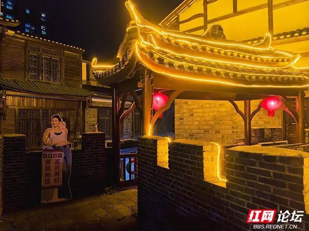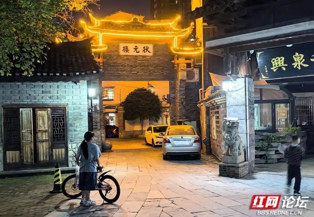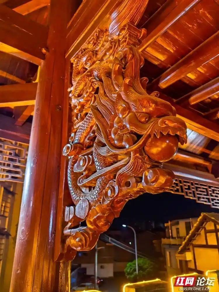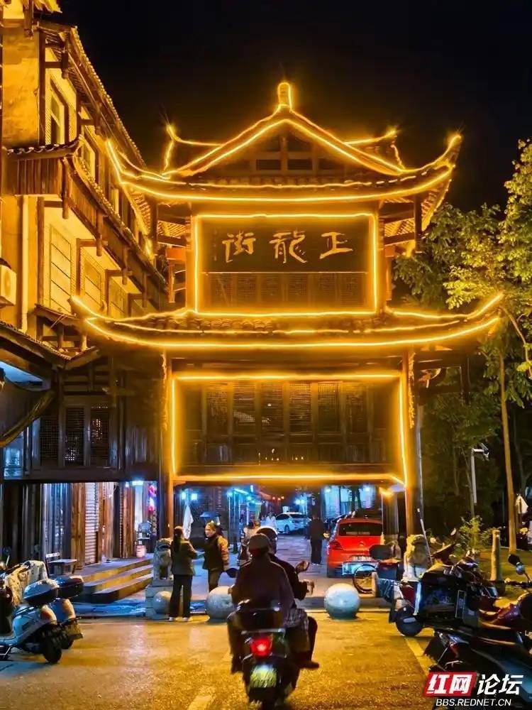 宁乡正龙古街的沉静夜色。(图源:王德璠)漫步在青砖石板路上,每一步都踏着历史的回响。看那木雕龙首栩栩如生,斗拱交错间尽显匠心;“成功门”下,石狮静默守护,红灯笼映照着古朴的民居。街巷里,晚归的机车穿行在光影之间,三两游人悠闲踱步,现代的生活气息与厚重的古街风貌在此刻巧妙交融。